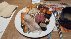 오늘은 직원들과 쿠우쿠우에 방문했습니다. 여러 종류의 초밥과 사이드 메뉴가 전반적으로 맛이 좋았습니다. 다만 사람이 많아서 단체 방문 시에는 예약이 필수라는 점 외에는 만족스러운 식사였습니다.